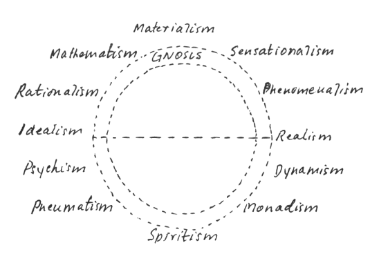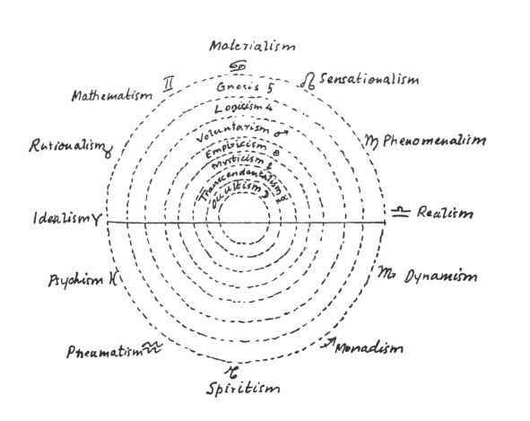 Empecemos con el idealismo y designémoslo como la constelación espiritual de Aries, luego el racionalismo como el de Tauro, el matematismo como Géminis, el materialismo como cáncer, el sensualismo como Leo, el fenomenalismo como Virgo, el realismo como Libra, el dinamismo como Escorpión, el monadismo como Sagitario, el espiritualismo como Capricornio, el pneumatismo como Acuario, y el psiquismo como Piscis,. Efectivamente, las relaciones que existen en el espacio exterior material en cuanto a las diferentes constelaciones zodiacales, existen asimismo en el reino del espíritu entre estas concepciones del mundo. En cambio las relaciones en que entran los siete planetas al girar a lo largo del zodíaco, corresponden a las relaciones en que entran los siete temples de concepciones del mundo, en la inteligencia de que podemos sentir un paralelismo entre gnosis y Saturno, logismo y Júpiter voluntarismo y Marte, empirismo y Sol, misticismo y Venus transcendentalismo y Mercurio, ocultismo y Luna.