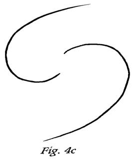 En la fig. 4c se ven dos curvas, una que es la expresión de un largo desarrollo en el pasado, es decir, toda la evolución anterior del cosmos que recapitula la individualidad del ser humano antes de nacer y que termina en el nacimiento. Ahora debe ser inaugurado algo nuevo. El alma encarnada es enviada con el fin de desarrollar ciertas capacidades aislándose en la Tierra. Sólo en la Tierra puede desarrollar esas fuerzas. Sabemos que están relacionadas principalmente con el desarrollo del Yo o sí mismo. Así que el ser humano es enviado, separado del mundo cósmico, y en la separación toma una nueva evolución y participa en la creación de un nuevo cosmos. La nueva evolución se indica por la segunda curva del símbolo (Fig. 4c).