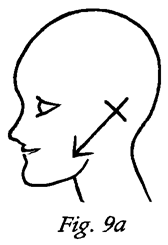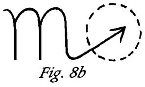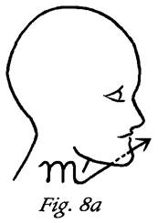 De nuevo tenemos un primero, segundo y tercer portal (Fig. 8b) en los tres trazos del símbolo. Sólo después de haber pasado a través de ellos podemos entrar en ese reino donde buscamos la manera de hacer algo, o por lo menos apuntar a algún acto. Esto se indica en la flecha al final del símbolo. En la cabeza Escorpio se encuentra en la región de la laringe (Fig. 8a) y, de hecho, se refiere a toda la región que sirve el proceso de formación del habla.
