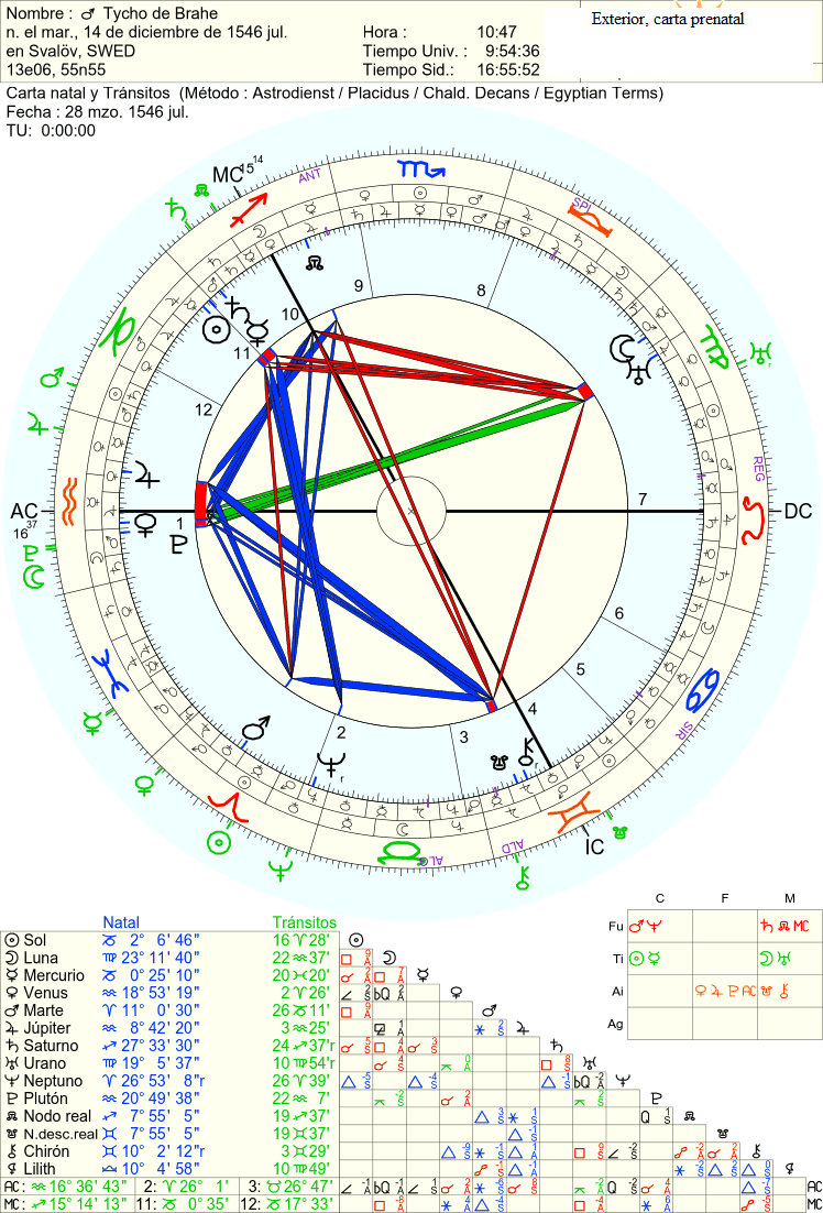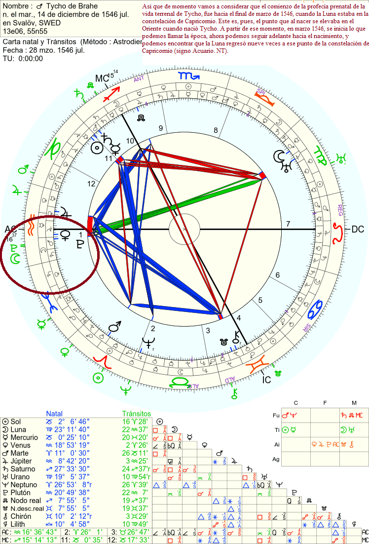 Ahora vamos a mirar de nuevo la natividad de Tycho de Brahe. Nació el 14 de diciembre de 1546. Por otra parte, se supone que su desarrollo embrionario duró unos 10 meses lunares de cuatro semanas cada uno. Por lo tanto, su concepción debe haber tenido lugar marzo 1546. Tenemos ciertos medios astronómicos por los cuales podemos definir más exactamente el momento de la concepción individual. Estos medios se derivan de muy antigua sabiduría que en parte se encuentra en lo que conocemos como la Regla Hermética de la antigua cosmología egipcia, pero que, en realidad, es mucho más profunda. Pero no podemos embarcarnos en esta cuestión aquí; es toda una ciencia en sí misma.