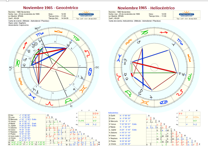 En el calendario heliocéntrico, los acontecimientos que se refieren al «gran patrón» se expresan con más fuerza. Saturno entra en oposición a Urano el 17 de noviembre. En el mismo día que Mercurio estará en conjunción a Saturno y, por tanto, también en oposición a Urano y Plutón. Por otra parte, Saturno se mueve en oposición a Plutón el 30 de noviembre. Estas últimas oposiciones a Urano y luego a Plutón, son significativas porque sólo ocurren una vez en el calendario heliocéntrico durante el período del «gran patrón». Por otro lado, también encontramos aspectos de trígono (120º relaciones angulares) de la Tierra con Urano el 8 de noviembre y el 9 de noviembre de Plutón desde el punto de vista heliocéntrico.