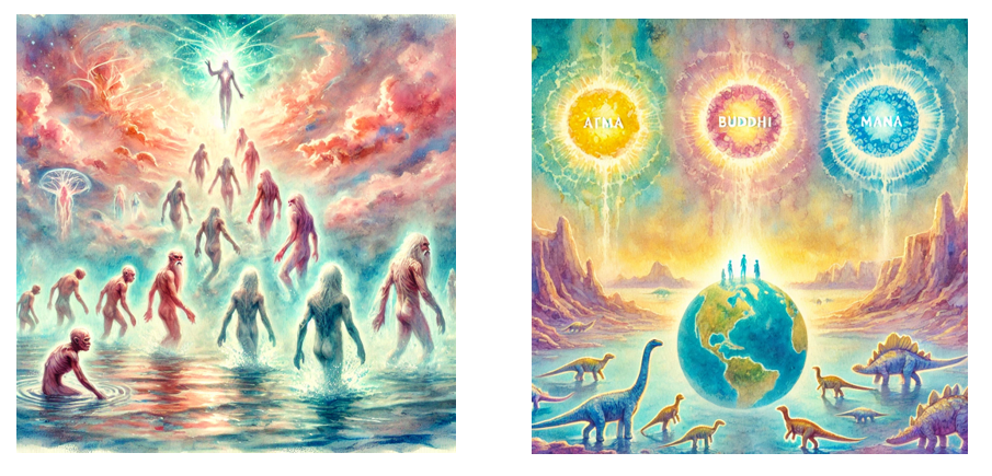 Mientras que en la Antigua Luna en los cuerpos físico, etérico y astral sólo se desarrollaba el ser inferior del hombre, la trinidad superior fue cuidada y fomentada. Estos principios habían alcanzado un cierto grado de madurez después de haber sido implantados: Atma en el Antiguo Saturno, Buddhi en el Antiguo Sol, Manas en la Antigua Luna. Entonces pudieron desarrollarse más en la Tierra. Lo que llegó a la Tierra desde la Antigua Luna en forma de cuerpos físico, etérico y astral son los animales grotescos en los que Atma, Buddhi y Manas se incorporaron gradualmente. Los Pitris lunares habían dejado de lado las partes inferiores, pero para compensar esto, habían cuidado y fomentado a Atma, Buddhi y Manas de una manera objetiva. A través de su cuidado y fomento lograron que un pensador pudiera desarrollarse en la Tierra. Si uno observa las criaturas externas en la Antigua Luna, éstas son las envolturas que rodeaban al hombre, no el hombre mismo. Las envolturas podían utilizarse porque el que las tenía, las habia avandonado [Vacío en el texto…] Ahora el material restante podría condensarse para formar el cerebro. En estado germinal, la materia para el cerebro estaba allí, pero sólo pudo condensarse después de que los Pitris se alejaran.