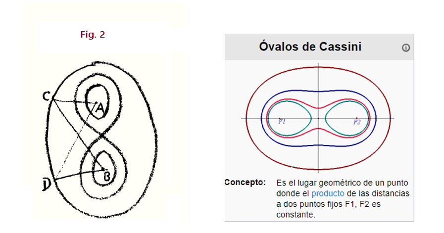 Hablando de la curva de Cassini, mostramos que tiene tres formas esenciales. Una, no muy diferente a una elipse: —esta forma surgió cuando los parámetros de la curva tenían una cierta relación, la que indicamos. La segunda forma fue la lemniscata. La tercera forma es que mientras en la idea de ella —y también analíticamente— es una entidad única, al mirarla no lo es. Tiene dos ramas (Fig. 2), pero las dos ramas son una curva. Para trazar la línea, de alguna manera deberíamos tener que salir del espacio, volviendo al espacio nuevamente cuando dibujamos la segunda rama. Conceptualmente, nuestra mano estaría dibujando una línea continua al dibujar las dos regiones que parecen separadas. No podemos trazar la línea continuamente dentro del espacio ordinario y, sin embargo, conceptualmente, lo que está aquí arriba y lo que está aquí abajo (la curva interior en la Figura 2) es una sola línea. Ahora, como también mencioné, la misma curva se puede pensar de otra manera. Puedes preguntar cuál será la trayectoria de un punto que cuando se ilumina desde un punto fijo A aparece con intensidad constante de iluminación, visto desde otro punto fijo B. Respuesta: una curva de Cassini. Una curva a Cassini será el foco de todos los puntos a través de los cuales debe pasar un punto, si cuando se ilumina desde un punto fijo A se ve alguna vez con la misma intensidad de luz desde otro punto fijo B (Fig. 2 nuevamente).