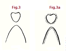 La rama superior tomará esta forma eventualmente. Si entonces altera la curva de Cassini tomando variables en lugar de constantes —para comenzar con ecuaciones en lugar de con constantes invariables— obtendrá dos tipos diferentes de ramas. Entonces también existirá la posibilidad de que una de las dos ramas entre por así decirlo desde el infinito y vuelva a salir al infinito. Esta es precisamente la relación a partir de la cual debes partir al seguir ciertas formas dentro de la cabeza humana, que las comprenden en curvas y líneas, y luego relacionarlos con las formas de órganos o de complejos de órganos en el sistema metabólico, que a su vez estará integrado en curvas y líneas. Tal es la complejidad de la forma humana. Para hacerlo aún menos simple, deben imaginar una línea (Fig. 3a) con una tendencia hacia afuera y la otra con su tendencia hacia adentro.
