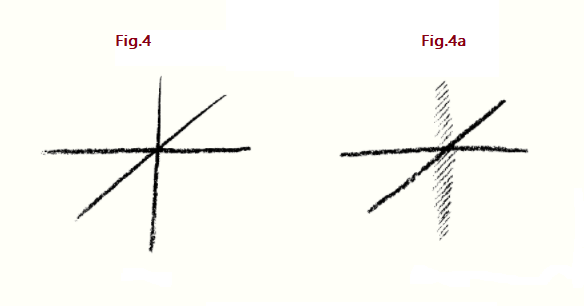 Entonces he, por así decirlo, llenado de pensamientos —en la idea y presentación mental de la misma— el espacio tridimensional con el que normalmente me enfrento. Ahora, como saben, en cualquiera de esos dominios no sólo pueden avanzar hasta cierto grado de intensidad; también puede restar de él, y a medida que continúan restando —quitando— llegas por fin a la negación de ti. Como bien saben, no solo hay riquezas sino también deudas. Del mismo modo, no sólo puedo hacer que surjan las tres dimensiones en el pensamiento, sino que también puedo hacerlas desaparecer. Solo que ahora imagino el surgimiento y la desaparición como un proceso real, —algo realmente está ahí. Por supuesto, es posible pensar solo en dos dimensiones en lugar de tres, pero ese no es mi significado. Lo que quiero decir ahora es esto: la razón por la que solo tengo dos dimensiones (Fig. 4a) No es que nunca haya tenido una tercera. La razón es que tenía una tercera y se ha desvanecido. Las dos dimensiones son el resultado del surgimiento y la desaparición de la tercera. Ahora tengo un espacio que, aunque exteriormente muestra sólo dos dimensiones, debe concebirse interiormente como si tuviera dos terceras dimensiones, una positiva y la otra negativa. La dimensión negativa surge de una fuente que ya no puede estar allí en mi espacio tridimensional. Tampoco debo pensar en ella como una «cuarta dimensión» en el sentido convencional. No, debo pensar que es, en la tercera dimensión, de positivo a negativo (Fig. 4a una vez más).