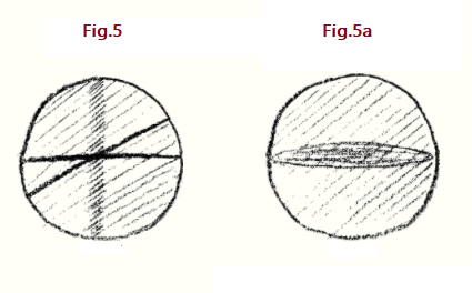 Y ahora supongamos que lo que he estado indicando está realmente en el Universo; sin embargo, como son las cosas generalmente en el mundo real, aproximadamente. Entonces no sería una interpretación pedantemicamente precisa sino aproximada de lo que he dibujado aquí. Esto no tiene por qué causarles ninguna gran sorpresa, porque en la realidad exterior perceptible por los sentidos nunca encuentras figuras matemáticas reproducidas de otra manera, siempre aproximadamente. Si entonces afirmo que la imagen representa algo real, solo esperaré que lo haga en un sentido aproximado. Para representar una realidad que le corresponda, no necesito repetir exactamente el mismo dibujo, pero debería dibujar algo aplanado; eso respondería a eso. El hecho de que algo haya estado allí y luego se haya desvanecido, quizás pueda sugerirlo de esta manera: supongo que la densidad de un efecto, indicada por el sombreado oscuro, surgió y luego se desvaneció parcialmente, se debilitó (Fig.5).