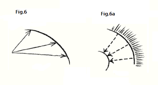 Pero si haces esto para la única curva planetaria —digamos por el camino de Venus con su bucle— harás igual justicia a los caminos de Júpiter o Marte con sus bucles, solo diciéndote a ti mismo: Esta vez no supondré un sistema de coordenadas polares con un origen tal que siempre tengo que agregar una pieza para obtener las coordenadas polares, como en la Figura 6. No, tomaré como origen de mi sistema de coordenadas polares la Esfera circundante (Figura 6a), es decir, lo que hay detrás de él, indeterminadamente lejos. Luego obtengo coordenadas como estas (líneas de puntos), donde en cada caso, en lugar de agregar, debo dejar muchas cosas fuera. La curva que obtengo también tiene algo así como un centro, pero el centro está en la esfera infinita.