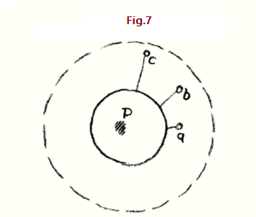 Porque esto está ahuecado, por así decirlo; este es el círculo invertido o la esfera invertida, si lo desean. Pero ahora suponga que lo siguiente podría ser el caso. Piense en lo que hay dentro de este círculo peculiar (es decir, en a, b, c, etc.) Piensen en este punto que tiene su curvatura hacia adentro. Porque, en efecto, todo el espacio fuera de esta superficie esférica es entonces un punto con su curvatura hacia adentro. Y ahora imagina que este espacio tenía, después de todo, su límite en alguna parte. Es posible que pueda ir muy lejos, muy lejos. Sin embargo, supongamos que la realidad fuera tal que no pudieras ir a cualquier parte, sino que, en algún lugar, después de todo, hubiera un límite de otro tipo (círculo de puntos en la Figura 7). Lo que allí parecería, como por necesidad interior, lo que en efecto pertenece al reino más allá del límite. Tendría que surgir una esfera equivalente en el interior, perteneciente a lo que hay fuera. Entonces tendrías que darte cuenta: allá afuera, más allá de una determinada esfera, algo todavía existe, es cierto, pero si quiero verlo debo mirar aquí (P), porque aquí vuelve a aparecer. La continuación de lo que está lejos por ahí se hace sentir aquí. Lo que busco cuando salgo a distancias infinitas, hace su aparición en mi interior y se me manifiesta desde este centro.