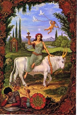 Después de su muerte, Osiris se convirtió en el gobernante del inframundo y juez de las almas de los muertos. A pesar de que murió en la conciencia humana, todavía trabaja como fuerzas cósmicas en la Tierra. Pero ya no reconocemos el origen divino cósmico de la materia terrestre. Por tanto, el cuerpo de Osiris está «enterrado» en la Tierra. Es la estupenda energía que se hace evidente en la «división» del átomo, aunque esto lleva la «muerte de Osiris» incluso un paso más allá, hacia la destrucción total. Así, la constelación de Tauro parece haber sido experimentada en épocas pasadas como una región cósmica que es una expresión del descenso de un impulso divino y su fusión con el ser de la Tierra o incluso la sustancia de la Tierra. El impulso divino que otorga un nuevo comienzo a la existencia inerte lo vimos en las manifestaciones de Aries. En Tauro, esto ha descendido un paso más y está activo como principio organizador de la materia. Esto también se expresa en un mito griego sobre Tauro. Zeus, cuya tarea era inaugurar la cultura griega y, con ello, dar una pauta al desenvolvimiento de la civilización europea, vio una vez desde sus alturas, dice la leyenda, a Europa, la hermosa hija del rey Agenor de Fenicia. Decidió llevarla a su reino. Para lograrlo asumió la forma de un toro blanco como la nieve y se mezcló con las manadas de Agenor. Europa se acercó para acariciar al animal, sentándose finalmente sobre su lomo, tras lo cual el toro corrió con tremenda velocidad hacia la playa, se zambulló en el mar y llevó a Europa rápidamente a la isla de Creta. Así, Zeus estaba asociado en la mitología griega con Tauro, el Toro, como lo vimos antes como Zeus-Ammón en la forma de Aries que huía a Egipto.