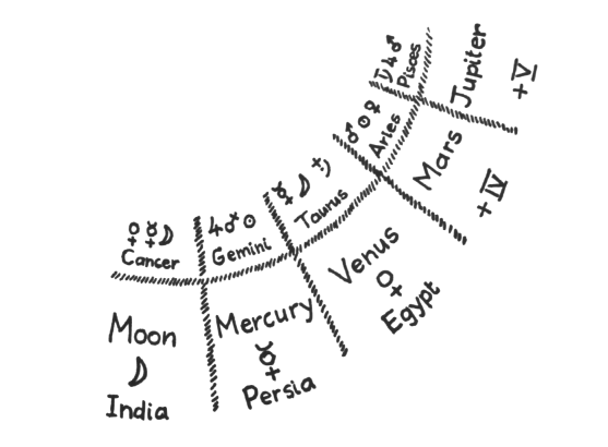 Así como la Luna tiene su domicilio en Cáncer, Mercurio tiene su domicilio en Géminis (ver Diagrama 2). Y así como en la primera época post-atlante la fuerza de la esfera sexual ayudó al hombre, por así decirlo, a alcanzar esa relación íntima con el mundo circundante del que hemos hablado, así en esta segunda época post-atlante se le brindó ayuda desde la esfera de Mercurio, la esfera conectada con las fuerzas de la parte inferior del cuerpo. Por un lado, las fuerzas del hombre pasan de la tierra al universo exterior, pero en esto, por así decirlo, el hombre es ayudado por algo todavía muy teñido de fuerzas atávicas, a saber, por lo que está conectado con las fuerzas de su sistema vascular, su sistema digestivo. El hombre no tiene realmente un sistema digestivo solo para digerir, es al mismo tiempo un instrumento de conocimiento. Estas cosas solo se han olvidado. Y el juicio real —no la sagacidad de la que he hablado últimamente— el verdadero discernimiento, el don de combinación realmente más profundo que se encuentra en conexión con los objetos, no procede de la cabeza, sino de la parte inferior del cuerpo, y fue útil para este segundo período post-atlante.