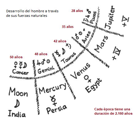 Ahora que ha pasado el tiempo de la inundación de la Atlántida, la sumersión de la Atlántida, que separa nuestra cultura post-atlante de la cultura atlante, surgió la primera época cultural post-atlante. Este fue un tiempo que recibió su influencia macrocósmica de tal manera que la fuerza que fluyó a través de la vida terrena fue la que corresponde a la salida del sol en el equinoccio vernal en el signo de Cáncer. Así podemos decir: cuando el sol entró en el signo de Cáncer en el equinoccio de primavera comenzó la primera civilización post-atlante. De hecho, podemos llamarlo la «civilización de Cáncer» —si la expresión no se malinterpreta. Si captamos las cosas en su verdadera luz, entonces podemos decir: cuando el sol salió en la primavera, estaba en el signo de Cáncer.