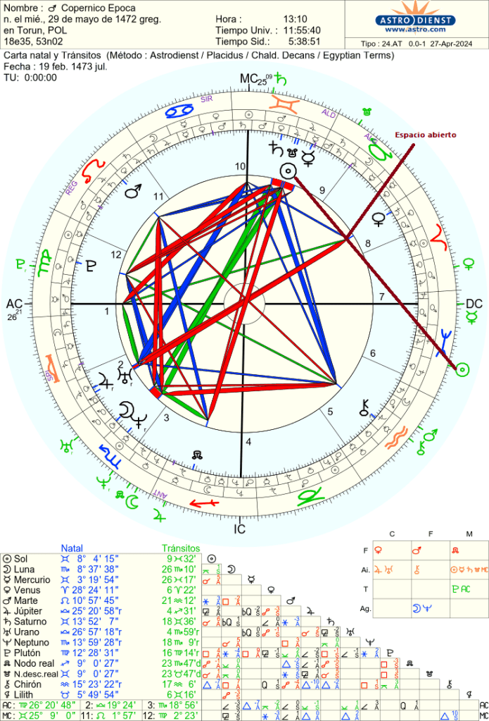 En relación con aproximadamente 1506, Mercurio en conjunción con Urano (quinto ciclo). En relación con aproximadamente 1507, Mercurio, Marte y Júpiter en conjunción en la constelación de Libra, seguido de conjunción con Neptuno (quinto ciclo). Relativo a aproximadamente 1510, Venus en conjunción superior con el Sol, también en la constelación de Libra (sexto ciclo). Es interesante ver que Mercurio y Venus, que mencionamos anteriormente en relación con los años decisivos posteriores a 1497, y Marte, asociado con la configuración de la raíz en la época, están involucrados en el reflejo prenatal de este tiempo en la vida de Copérnico.