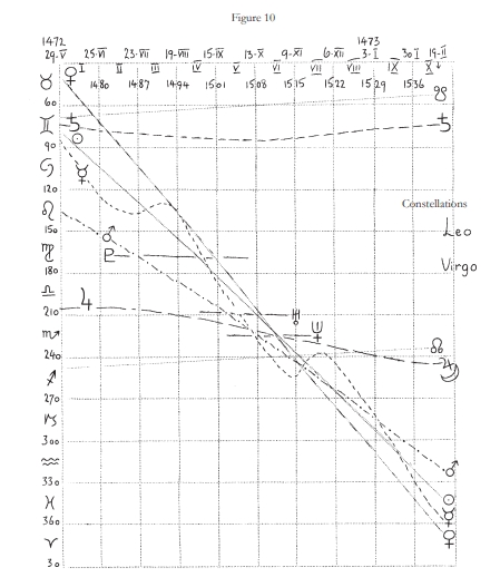Por lo tanto, debemos esperar que, en 1497, Copérnico se encontró con el impacto total de estas concepciones que obviamente tomó muy en serio y nunca dejaría ir en su vida posterior. Para nosotros, ahora es interesante e instructivo estudiar un poco más de cerca el reflejo de estos eventos en el cuadro prenatal. Refiriéndose a la época de 1497, el Sol estaba en conjunción con Plutón cerca de la «cabeza» de la constelación de Virgo. La antigua Isis (según el Zodíaco en el templo de Denderah), o Reina del Cielo, la Virgen de la Revelación de Juan el Divino, capítulo XII, está coronada con una corona de estrellas. Así tenemos aquí la referencia a la ciencia de la sabiduría de las estrellas. Al mismo tiempo, Venus y Mercurio, este último recién salido de retrógrado (ver Fig. 10), estaban en la constelación de Leo. La última constelación está particularmente asociada con la cosmología. (Vea el trasfondo mitológico de Virgo y Leo como se describe en Star Journal de agosto y septiembre de 1966). El mismo símbolo que usamos (♌) lo confirma, descendiendo de la periferia o ascendiendo a ella. Sobre esta base, ahora podemos ver que la combinación de Marte y Plutón en la carta heliocéntrica de la época, de hecho, reflejaba una revolución. La conexión con la cabeza coronada de estrellas de Virgo, además, sugiere una revolución con respecto a la astronomía. Sin embargo, la pregunta de por qué fue Copérnico quien se convirtió en el instigador no puede responderse sólo sobre esta base, porque innumerables otras almas habían heredado, por así decirlo, esta misma conjunción. Esto necesita más.