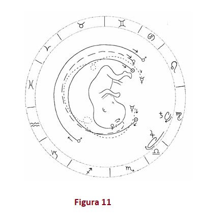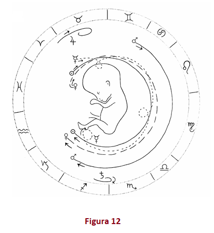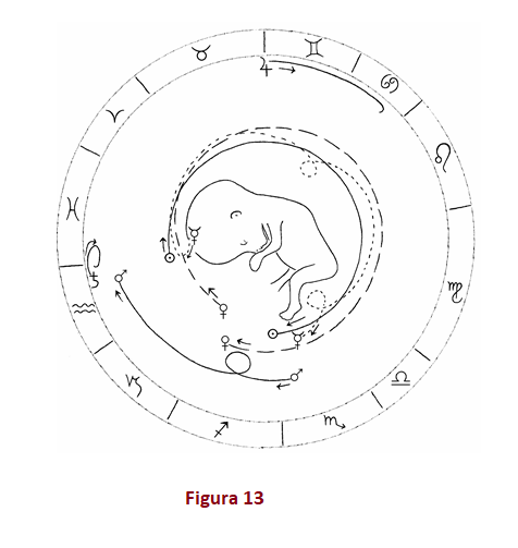 El punto principal, sin embargo, es el hecho de que Marte obstruyó a Júpiter con la relación angular de 90°. La obstrucción estaba estrechamente relacionada con la cabeza de la imagen del embrión. Marte en esa posición en Géminis infundiría una tendencia biológica de abstenerse de tocar la Tierra, una especie de condición fisiológica hacia este planeta. Esto se combinaría con la naturaleza peculiar de Júpiter y finalmente aparecería externamente como pies deformes. Que esto le suceda a un ser humano es una cuestión de su destino individual. No puede explicarse realmente excepto por una consideración de las encarnaciones pasadas. Aquí, en el asterograma de gestación, sólo podemos observar cómo las fuerzas del cosmos ofrecen la posibilidad de adquirir un cuerpo que esté en conformidad con el destino causado por las experiencias de las encarnaciones anteriores.