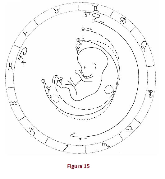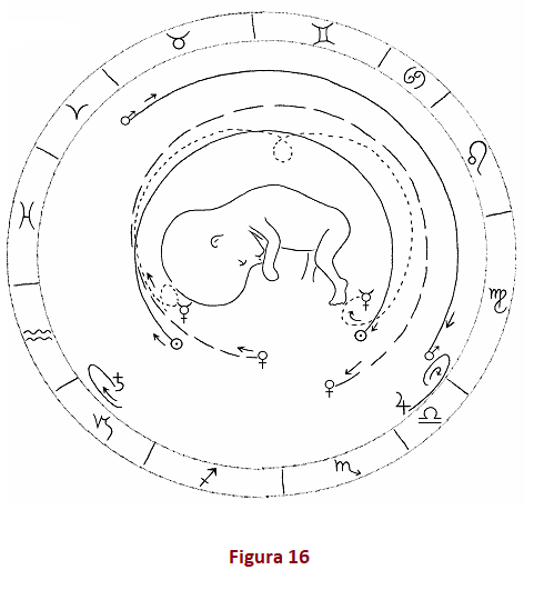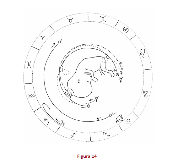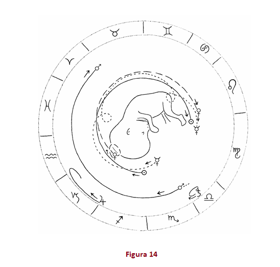 Las curvas dentro del círculo del Zodíaco indican los gestos de los planetas, incluyendo movimientos retrógrados o bucles, en el curso de la gestación particular, con un promedio de diez meses lunares. En todos los diagramas, hemos tomado deliberadamente un punto de vista geocéntrico, porque imaginamos que el embrión imita los eventos del cosmos, como imágenes en el plano curvo de la esfera aparente del cielo. Desafortunadamente, no podemos producir imágenes en perspectiva del embrión dentro del espacio cósmico tridimensional y hemos reducido los diagramas al plano del Zodíaco, que es también el plano de las órbitas de los planetas.