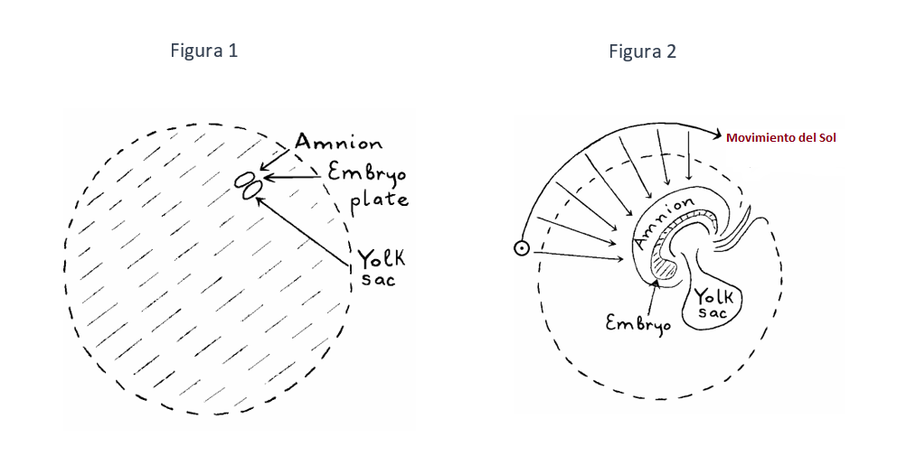 Este cuadro inicial cambia rápidamente durante las fases posteriores del desarrollo. La figura 2 representa dicha fase posterior. Las dos tendencias, expresadas por el amnios y el saco vitelino, muestran claramente sus direcciones opuestas. El amnios se curva y el saco vitelino forma una especie de globo. Posteriormente esto se pronuncia aún más. El amnios se expande hacia la periferia del óvulo. Proporciona los «ladrillos de la vida» o “ladrillos base” para la piel, el sistema nervioso periférico, etc. Del saco vitelino y sus derivados, surgen los tejidos relacionados principalmente con el tracto alimentario (el sistema metabólico).