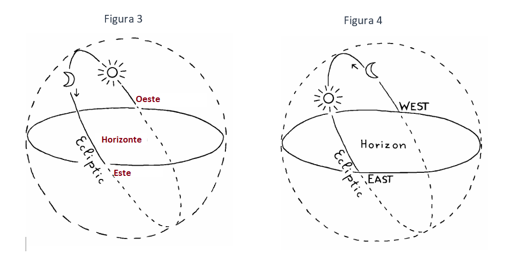 1) La Luna puede estar creciendo sobre el horizonte en el momento del nacimiento (Fig. 3). En este caso, el punto de salida (en o cerca del este), que puede ser calculado astronómicamente, es el lugar de la eclíptica donde la Luna estaba en el momento de la época. Podemos asumir que la Luna no completó los diez ciclos de 27,3 días cada uno = 273 días. Al promedio de 273 días hay que restarle el tiempo que necesita para desplazarse desde su lugar en el dibujo hasta el punto en que el horizonte oriental intercepta la eclíptica.