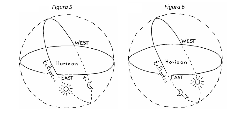 4) Consideramos ahora la posibilidad de que la Luna esté menguando y por debajo del horizonte (Fig. 6). Todavía le queda una buena distancia hasta llegar a ese lugar de la eclíptica que se está fijando al nacer. Por lo tanto, el intervalo entre la época y el nacimiento debe haber sido más corto para el tiempo que la Luna necesita para moverse de su posición actual al oeste del horizonte de Nacimiento