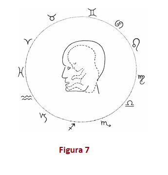 Una posible conexión de la forma humana arquetípica con el zodíaco se sugiere en la Fig. 7. Sin embargo, nos gustaría enfatizar que este es sólo un aspecto, que puede ser ampliado y que es apoyado por otros. De ninguna manera queremos sugerir que esta cabeza arquetípica debe ser imaginada como la complejidad perfeccionada de la organización de la cabeza de un ser humano terrenal actual. Cuanto más seamos capaces de concebirla sólo como un foco cósmico de potencialidad, siendo capaz de ejercer sus fuerzas en cualquier momento y en cualquier dirección, más nos acercaremos a la realidad que tenemos en mente.