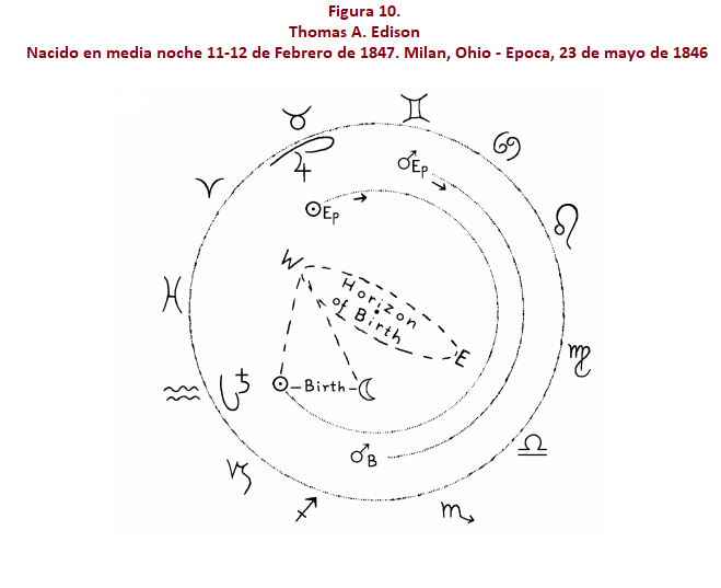 El asterograma prenatal de Thomas Edison (Fig. 10) indica que la Luna estaba en fase menguante y por debajo del horizonte cuando nació; por tanto, se encontraba en la constelación de Aries durante la época, que se estaba poniendo en el momento del nacimiento. Como la Luna tuvo que desplazarse una distancia considerable hasta llegar a ese punto después del nacimiento, el intervalo entre la época y el nacimiento fue inferior a 273 días. Por cálculo llegamos al 23 de mayo de 1846, como fecha real de la época.