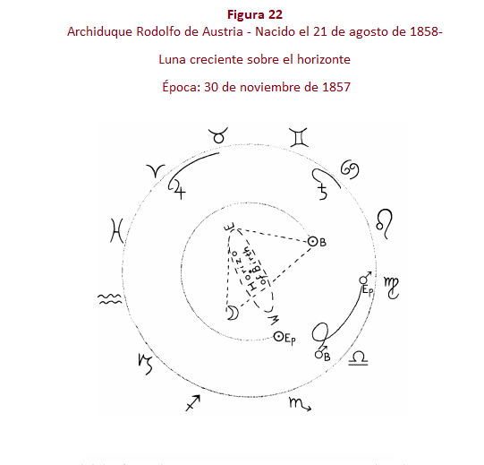 El asterograma prenatal del Archiduque Rodolfo tiene cierta similitud con el de T. E. Lawrence (Fig. 20). La relación del Sol y de Marte es prácticamente la misma, sólo que en el caso de Rodolfo las posiciones de ambos están desplazadas en Libra y Escorpio. (Por ejemplo, el bucle de Marte de Lawrence estaba todavía en Virgo, el de Rudolph estaba en Libra/Escorpio). En cierto sentido, Rudolph debió considerar su vida como un fracaso, al igual que Lawrence no superó su remordimiento con respecto a su fracaso en la cuestión árabe.