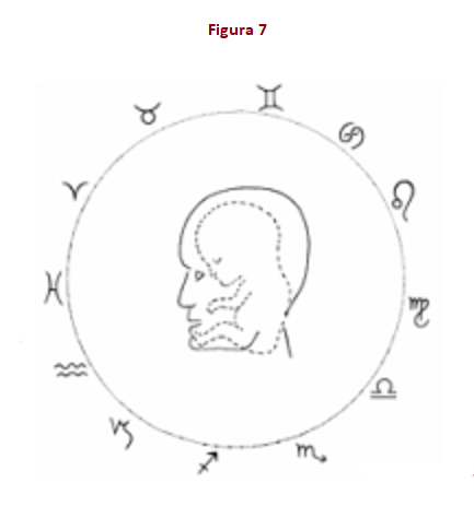 Esta tendencia es aún más pronunciada en Escorpio. Esta constelación está relacionada con la región de la laringe en la imagen de la cabeza humana arquetípica (Fig. 7). Las personas que han recibido este impacto, por ejemplo, a través de su Sol en la época, suelen ser prominentes en la esfera de la palabra. Pueden ser, en cierto sentido, el portavoz de épocas enteras de la evolución humana, expresiones de etapas de la historia humana. Por lo general, todavía están más urgidos a la acción externa que el tipo Escorpión, pero muy a menudo se trata de que puedan equilibrar su impulso a la acción mediante un conocimiento autocontrolado de las necesidades de una determinada edad y mediante el poder de distinción entre el engaño y la inspiración genuina.