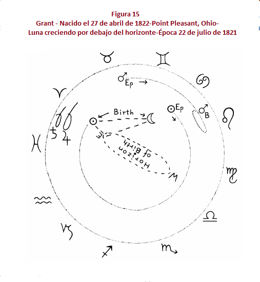 Ulysses S. Grant, como general y finalmente como comandante supremo, participó en la Guerra Civil estadounidense en el bando de la Unión del Norte contra los Confederados del Sur. Su conducta durante la guerra, hasta la victoria final de la Unión, demuestra que poseía algo más que una determinación férrea y una energía indomable. Había algo más que sólo podemos comprender sobre el fondo de su herencia de un Sol en Cáncer en el momento de su época prenatal (Fig. 15). Su resistencia a pesar de los contratiempos, de las terribles pérdidas y de la incesante lucha, revela que en él actuaba algo más elevado que una mente humana limitada. Se inspiró en el destino de los Estados Unidos en los siglos venideros por esas fuerzas espirituales que forman y mantienen una nación, aunque puede que no lo haya experimentado tan conscientemente.