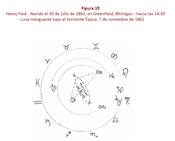 Uno de los mejores ejemplos de incentivo de Libra es el asterograma de Henry Ford (Fig. 19). Su Sol de la época estaba en Libra. Vemos los últimos rastros de la «inversión» todavía en funcionamiento hasta las constelaciones de Leo y Virgo. Henry Ford trabajó y estableció su éxito enteramente sobre la base de ideas sociales sanas. Su vida, hasta la fundación de la compañía Ford, muestra que no hizo ningún compromiso barato, incluso a costa de las dificultades. Su idea motriz desde el principio fue el servicio, trabajando sin restricciones para el consumidor, y no construyendo su producción únicamente sobre el principio del beneficio y la rentabilidad. Fue un intento valiente de introducir el «altruismo» en la economía, y su éxito posterior demostró que su idea era correcta y sólida. «El beneficio no puede ser la base, debe ser el resultado del servicio».