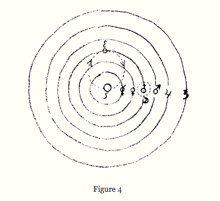De ninguna manera fue mi principal intención permitir que estas conferencias culminen de esta manera. En principio, no estoy predispuesto a proponer cosas que no se ajusten a las nociones aceptadas. Solo queremos llegar a la verdad. Sin embargo, tal como están las cosas, las suposiciones de la imagen del mundo astronómico moderno implican tantas contradicciones que al final, habiendo estudiado la astronomía actual, uno sale insatisfecho. Hipotéticamente, comienza asumiendo la imagen del mundo que también he indicado en este bosquejo (Fig.4) —las órbitas elípticas de los planetas, el Sol en un foco, etc. Entonces se supone que las órbitas planetarias están en diferentes planos, inclinados entre sí. Porque no hay alternativa en esta etapa; las diferentes inclinaciones vienen dadas por la perspectiva. Las complicaciones son complicaciones de perspectiva. Sin embargo, los cálculos reales no se basan en la base de este simple sistema solar que la gente les ha explicado en la escuela y luego se conserva de por vida. En la práctica, parten del sistema Tychónico. Luego, se debe aplicar una corrección tras otra. A partir de las fórmulas aceptadas, se calcula, digamos, la posición del Sol en un momento dado, y no se cumple. En lugar de que el Sol real esté allí, estará el Sol Medio Astronómico Dinámico —algo ficticio, por tanto. Así es una y otra vez: las entidades imaginadas están ahí, y se deben introducir más correcciones para llegar a lo que es real. En estas correcciones se esconde aquello que conduciría a la verdad. En lugar de aferrarse a las fórmulas convencionales y ser conducido a entidades ficticias, uno debería traer movimiento a las fórmulas mismas—hacerlos inherentemente móviles— y luego dibujen las curvas en consecuencia. Si lo hicieran, pronto llegarían al sistema aquí dibujado, aunque repito, los dibujos son esquemáticos.