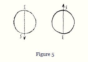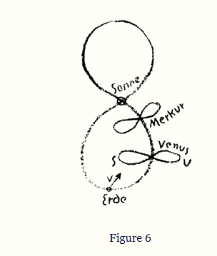 Trazando el camino de la Tierra y el Sol (ahora, una vez más, aparte del sistema planetario en su conjunto) tenemos que imaginar una Lemniscata en la que la Tierra sigue al Sol. Aquí está, proyectado (Fig. 6). Por cierto, también puede ver en esto una posibilidad de dar sentido a la idea de gravitación. El uno atrae al otro tras él: ese es el principio subyacente. Piénsenlo de esta manera, y ya no necesitarán la cualidad algo cuestionable de las fuerzas gravitacionales y tangenciales, ya que aquí se reducen a una sola fuerza. Piénsenlo detenidamente y lo encontrarán. Deben admitir que es una característica bastante problemática en la concepción newtoniana. Debemos pensar en el Sol en el centro y en los planetas que lo rodean —dotados, todos y cada uno, de una especie de «empujón» en la dirección tangencial, todos y cada uno, sin presuponer que el sistema newtoniano se rompería.
