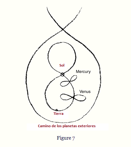 Es un sistema de lemniscatas en determinado orden y relación. Tales son los caminos de los planetas; tal es también el camino de la Tierra y el Sol. Ahora armonizarán fácilmente lo que he presentado aquí en el esquema gramatical, con el hecho de que vemos los bucles de Venus y Mercurio en conjunción y los de Júpiter, Marte y Saturno en oposición. En nuestra perspectiva, es el resultado necesario. Sobre todo, reconocerán una vez más cuál es la conexión entre estos planos y el ser humano. Solo necesitan mirar esta imagen y se dirán a sí mismos: Lo que tienen aquí, en Mercurio y Venus, se acerca a la dirección del camino de la Tierra y el Sol. Están en la vecindad cósmica, por así decirlo, del camino de la Tierra y el Sol. Por lo tanto, está en esta relación: tiene que ver con la línea radial, fundamentalmente, la línea de conexión de la Tierra y el Sol. Frente a esto, los otros caminos —los de los planetas exteriores o superiores— funcionan más en virtud de su dirección lateral o esférica. En sus efectos, se acercan más a lo periférico en movimiento. Entonces también podemos formularlo así: Lo que contemplamos en Venus y Mercurio es mucho más parecido a lo que vive como una realidad cósmica en nosotros mismos. Mientras que, lo que vemos en los caminos de los planetas exteriores es más parecido a los Cielos de estrellas fijas en general. También aquí llegamos a una especie de valoración cualitativa de lo que está ocurriendo en el Cosmos. Por supuesto, las líneas que he estado dibujando solo se expresan en forma de diagrama. Realmente debería expresarse de esta manera: un planeta interior tiene un camino, lo que hace una curva de bucle de lemniscata cuyo centro es el camino de la Tierra y el Sol en sí. Un planeta superior, por otro lado, abraza el camino de la Tierra y el Sol en su propio bucle de lemniscata. Ésa es la esencia del asunto; la cosa en sí es tan complicada que las imágenes mentales que podemos formar apenas pueden ser más que esquemáticas.