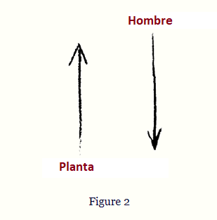 Aquí tenemos que buscar una comprensión de la forma humana, su dirección vertical. Debemos imaginar que mientras el hombre sin duda crece hacia arriba, una especie de formación vegetal invisible crece hacia abajo para encontrarse con él. Es una forma de planta con sus raíces desplegándose hacia la cabeza y sus flores hacia abajo. Es un proceso de formación vegetal negativo, opuesto al proceso de formación del hombre. En este sentido debemos reconocer, qué movimientos son similares en especie. A medida que la planta crece lejos de la Tierra, también tenemos que imaginarnos a este hombre-planta suprafísico creciendo desde el espacio cósmico, incluso desde el Sol, hacia el centro de la Tierra. Entonces esto es lo que tenemos. (Repito, solo puedo indicar direcciones generales: podrán seguirlas a la luz de los fenómenos empíricos) En lo que aquí vemos (Fig.2) como una línea de igual dirección —una línea de crecimiento, pero en un caso esforzándose positivamente hacia afuera, en el otro negativamente hacia atrás y hacia abajo— en esto tenemos que buscar la línea de conexión entre la Tierra y el Sol. No pueden pensar en ello de otra manera. Es más, imaginarlo así es comparativamente simple, incluso trivial. Percibirán en esta misma línea, la línea de movimiento tanto de la Tierra como del Sol. Las líneas de movimiento tanto de la Tierra como del Sol deben buscarse en la línea que une a los dos. Además, la línea siempre resultará ser vertical en relación con la superficie de la Tierra.