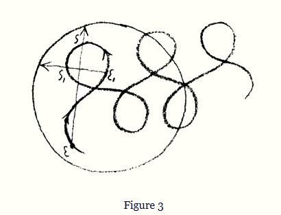 Ahora seguiré una línea de pensamiento que puede parecer problemática para algunos de ustedes, sin embargo, sentirían que sería completamente acertada si tuviéramos tiempo para entrar en todos los eslabones de conexión y, como acabo de decir, quiero darles algo más sustancial. Tenemos que buscar una curva que nos permita imaginar los movimientos del Sol y de la Tierra siguiendo su curso en el mismo camino y, sin embargo, en cierto sentido al revés. La curva se puede determinar sin ambigüedades. Si contemplan todas las posiciones geométricas relevantes que se encuentran de esta manera, la curva, repito, estará determinada de forma única. Deben imaginarlo así (Fig.3) —una lemniscata rotatoria que al mismo tiempo avanza a través del espacio, dando como resultado un tornillo lemniscatorio en espiral (como se indica en la Figura). Imaginen que la Tierra está en algún punto de esta curva y el Sol en otro, con la Tierra siguiendo al Sol en movimiento. Entonces tienen el movimiento de la Tierra aquí arriba, el Sol aquí abajo. Pasan uno al otro. Teniendo en cuenta todos los criterios válidos, esta es la única forma de concebir los movimientos subyacentes reales tanto de la Tierra como del Sol. No hay otra alternativa que imaginarla surgiendo sobre esta base: la Tierra y el Sol se mueven, uno tras otro, a lo largo de una espiral lemniscatoria; lo que se proyecta en el espacio surge de esto.