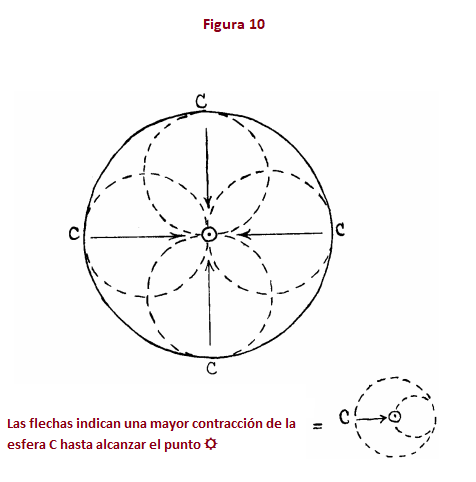 Hasta ahora, imaginamos que la Tierra, la Luna y los planetas interiores todavía estaban unidos al Sol. ¿Cómo podemos visualizar las separaciones posteriores? En la figura 4, representamos al Sol aún mayor, todavía unido, de pie en el centro ideal de las tres esferas A, B y C, que ya habían llegado a existir. Podríamos pensar que ya no es posible una mayor contracción, porque la esfera C se había agotado, por así decirlo, en el punto del Sol (ver Fig. 10). Los cuatro círculos que tocan C deben imaginarse como representativos de un número infinito de círculos a lo largo del círculo mayor C. Sin embargo, un examen más detenido revela que aún era posible una mayor contracción. En la figura 11 se intenta una demostración de esta posibilidad. Sin embargo, debemos imaginar que los cuatro grupos de círculos tangenciales que se mueven hacia los puntos C están destinados a representar un número infinito de tales grupos a lo largo del círculo, o esfera C Pensamos que no era prudente incluir más de estos cuatro grupos de círculos en el diagrama, porque de lo contrario podría volverse ininteligible.