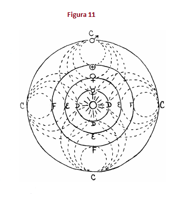 Ahora debemos imaginar que el impulso de contracción en el universo solar continuó al comienzo de la cuarta o actual condición de forma. En consecuencia, deberíamos encontrar en un momento determinado un cuerpo central alrededor o en la vecindad del centro ideal de todas las esferas en la figura 4. Este «cuerpo» dentro de la esfera de Marte era el Sol, que entonces aún conservaba en su ser la Tierra, la Luna y los denominados planetas interiores Mercurio y Venus.