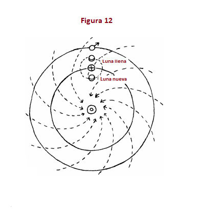 Dentro del vórtice creativo de este Sol mayor, la Luna-Tierra de la que hablamos apareció en un momento determinado. Estaba expuesto, por así decirlo, a la corriente de sustancia zodiacal cósmica, que era succionada por el Sol desde la periferia hacia el centro (ver Fig. 12). Si, además, imaginamos que la Tierra comenzó a moverse a lo largo de su órbita, podemos comprender fácilmente que nuestro planeta estuvo expuesto en el tiempo a toda la sustancia zodiacal atraída por el Sol. La última etapa por la que pasó esta sustancia antes de llegar a la Tierra fue la esfera de Marte, la región de los prototipos de objetos físicos. Un paso cósmico más allá, en la Tierra, estos prototipos fueron infundidos o impresos en la materia. Este es uno de los aspectos de la creación de un mundo terrestre material.
