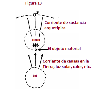 Estas emanaciones se irradian desde el Sol hacia el espacio cósmico. Así, por ejemplo, la Tierra está expuesta a un impacto doble (ver Fig. 13). De la profundidad del espacio cósmico provienen los arquetipos espirituales del mundo de los objetos físicos. Del Sol viene la luz y el calor, etc., en el que están contenidas las “cenizas” de los arquetipos originalmente puramente espirituales, que ahora se han reducido a una caricatura no espiritual, por así decirlo. Este doble impacto es la base de ese mundo espacial de la materia. La materia es «calcificada», espíritu congelado. En la Tierra, las dos corrientes chocan, en otras palabras, los arquetipos cósmicos se imprimen en la materia terrestre. Una simple consideración puede ayudar a aclarar esta imagen: la luz del día, la luz del sol, hace que los objetos físicos sean comprensibles para los sentidos. El calor del Sol permite que los seres vivos permanezcan temporalmente en forma espacial.