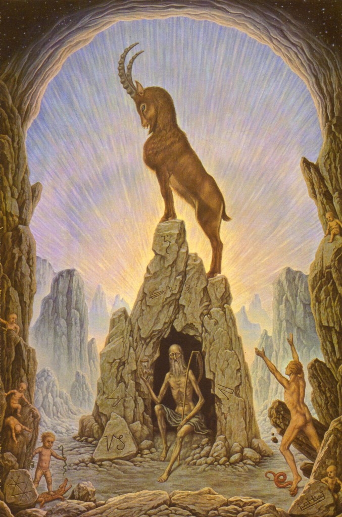 El aspecto más dramático de Capricornio es el derivado de la evolución de la Luna Antigua. Anteriormente señalamos que el rasgo significativo de la Luna Antigua fue una escisión universal, en el curso de la cual el predecesor del actual Sol se separó de la Luna. La Luna se había vuelto demasiado densa para los rangos superiores de las jerarquías espirituales. Fue dejada a su propio curso, pero pronto fue tomada por espíritus rebeldes de carácter luciferino. Lograron implantar los primeros comienzos del egoísmo en nuestro ancestro lunar. Esto fue acompañado por un mayor grado de densificación de la sustancia lunar que el visualizado originalmente por la guía divina. Este desarrollo hizo que se alejara más de su origen en el espíritu. Por lo tanto, las criaturas que vivían en cuerpos de sustancia lunar exhibieron las primeras consecuencias de la emancipación luciferina del mundo espiritual superior, y desarrollaron, así, los rudimentos de la enfermedad y la muerte.