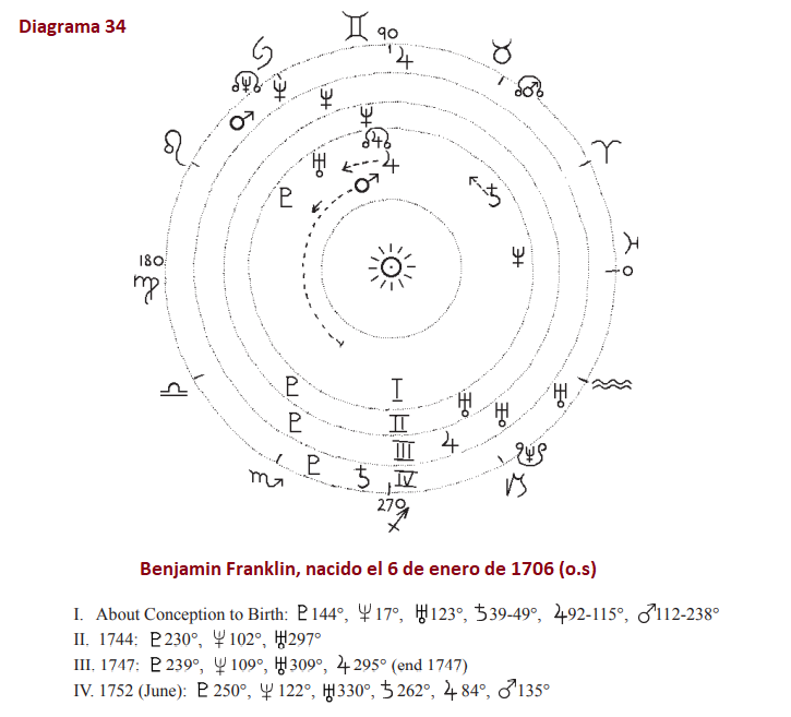 El diagrama o asterograma 34 presenta en el círculo interno (I) las posiciones y movimientos de los planetas durante la gestación de Benjamin Franklin (nacido el 17 de enero de 1706). Por ejemplo, Marte comenzó en 112° de la eclíptica el 17 de abril de 1705, nueve meses antes del nacimiento, y había llegado aproximadamente a 238° el 17 de enero de 1706. Los movimientos de Júpiter y Saturno también están indicados, mientras que los movimientos de Urano, Neptuno y Plutón son demasiado pequeños para expresarlos en el dibujo.