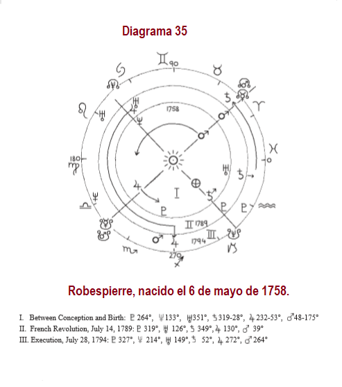 La posición de Robespierre, por supuesto, se hizo difícil por el tránsito de Plutón en 1789-1794 a través del lugar de Saturno durante la gestación. Hay una indicación de un peligro al que parece haber sucumbido: un testamento extranjero toma posesión de él. Plutón es el foco de una voluntad extra solar que puede manifestarse en uno como una voluntad humana extra.