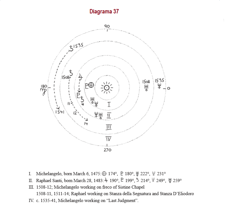 La idea de que estas creaciones fueron inspiradas en Virgo se ve reforzada por el hecho de que 30 años después, cuando Saturno regresó a Virgo, Miguel Ángel estaba trabajando en el Juicio Final en la Capilla Sixtina. Comenzó alrededor de 1535, pero la pintura no se terminó antes de 1541. Durante esos años, Saturno se movió a través de las constelaciones de Leo y Virgo (diagrama 37, círculo IV). También se había opuesto a Neptuno, mientras que se había opuesto a Urano 30 años antes. El diagrama muestra la relación de los eventos con las posiciones principales en los dos asterogramas de encarnación. Estos últimos son, por así decirlo, los «órganos de los sentidos» que se habían incorporado a la corporeidad de los dos artistas. Cuando los tránsitos de los planetas particulares ocurrieron durante su vida, ambos parecen haber experimentado, sin conocer el trasfondo cósmico, el enigma cósmico «Humanidad».
