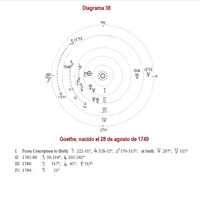 A continuación, presentamos (diagrama 38) el asterograma de Goethe, que nació el 28 de agosto de 1749. Por supuesto, no podemos estar seguros de la fecha de la concepción. Por lo tanto, simplemente estamos volviendo a una posición de la Tierra aproximadamente 270° menos que la de nacimiento, que corresponde a un intervalo de aproximadamente 9 meses.