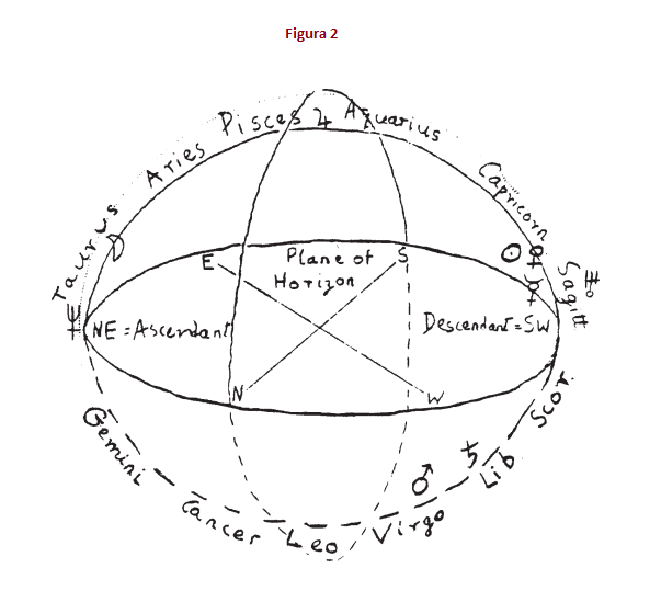 La elipse central nos da el plano del horizonte en ese momento, dividiendo el cielo en la parte visible de arriba y la parte invisible de abajo. A la izquierda (NE = noreste) está el punto de salida o ascendente, a la derecha la puesta (SW = suroeste), o descendente. (Esto se hace desde el enfoque visual, es decir, como si miráramos hacia el sur. También se puede hacer desde un ángulo contemplativo, apartándose de lo visual, mirando hacia N = norte, y así contemplándolo). La elipse vertical representa el medio meridiano visible en el que culmina la eclíptica en ese momento, y abajo está la parte invisible del meridiano. Según este dibujo, el cuadrante de arriba y de la izquierda parece contener una parte mucho mayor de la eclíptica que el de la derecha. Esto se debe al hecho de que la eclíptica, o el zodíaco, se elevaba muy al noreste y tenía que abarcar una gran porción de espacio hasta llegar por encima del punto sur del espacio local, o el meridiano del lugar de nacimiento.