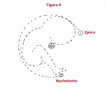 3. La Luna puede estar menguando en el momento del nacimiento y por debajo del horizonte. En este caso la Luna ha estado en la época en el lugar de la eclíptica que se está poniendo al nacer (descendente), y el tiempo entre la época y el nacimiento sería más corto. [Por ejemplo, si Kepler hubiera nacido una semana después, la Luna habría estado en unos 130° al nacer (el 3 de enero de 1572). Un día o dos antes tuvo lugar la Luna llena; por lo tanto, la Luna estaba menguando el 3 de enero y por debajo del horizonte oriental (a unos 83° de la eclíptica). En este caso, la Luna de la época habría estado en unos 263° -o descendiente posterior del nacimiento de Kepler- hacia el 13 o 14 de abril de 1571. El tiempo entre la época y el nacimiento habría sido entonces de 265 días].