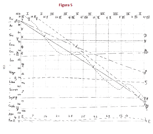 En el asterograma prenatal de Kepler encontramos que Saturno estaba retrógrado al comienzo del desarrollo embrionario y se volvió directo durante el 4º ciclo lunar prenatal. Incluimos en la Fig. 5 un diagrama de los movimientos planetarios geocéntricos durante el desarrollo prenatal de Kepler. Las divisiones horizontales dan el elemento tiempo, dividido en los diez ciclos lunares siderales de unos 27,3 días cada uno. Las divisiones verticales indican los signos y las constelaciones (borde izquierdo). Insertando los movimientos de los planetas, relacionados con el espacio y el tiempo, obtenemos las líneas y curvas contenidas en el gráfico que aparece en la página siguiente en la Figura 5: