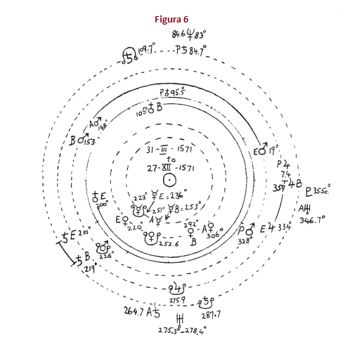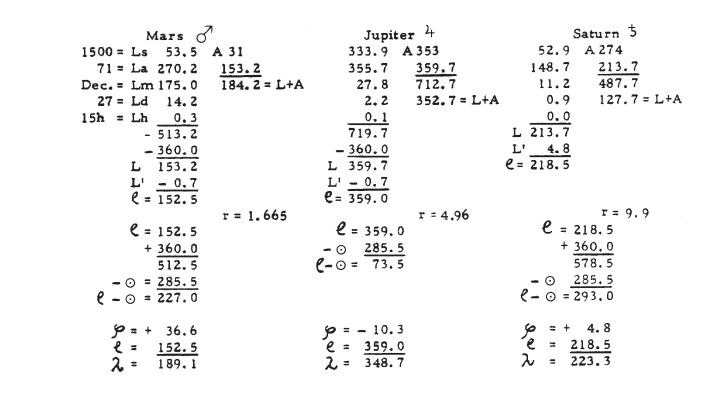 Como eventualmente necesitaremos las posiciones heliocéntricas de los planetas para la fecha de nacimiento de Kepler, ahora calcularemos estas últimas, y también las geocéntricas, con la ayuda de Astronomisch-chronologische Tafeln ruer Sonne, Mond und Planeten, del Dr. Paul Ahnert, Joh. Ambrosius Barth-Verlag, Leipzig, 1968. El método empleado es relativamente sencillo: hay que sumar las posiciones de los planetas, dadas para los comienzos de los siglos, años, meses y días, y luego rectificarlas. Así se obtienen los datos heliocéntricos que se pueden convertir en datos geocéntricos. En la Introducción (p. 16-17) se dan ejemplos de cálculo que, al consistir en cifras matemáticas, pueden seguirse incluso si se carece de conocimientos de la lengua alemana.