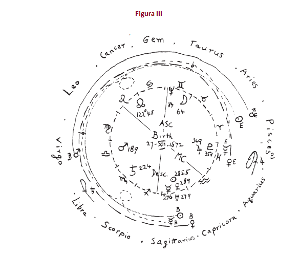 El Saturno de Kepler habría pasado entonces por las regiones «embrionarias cósmicas» que en la vida dan al ser humano la capacidad de pasar finalmente del estado de encierro en el cuerpo al movimiento exterior y a la integración en el entorno. Por el poder del décimo sector (♑ rodillas, articulaciones en sentido amplio), donde estaba Saturno al nacer, recibiríamos entonces la capacidad de encontrarnos con el entorno, de enfrentarnos a él, posiblemente incluso de resistirlo. No cabe duda de que Kepler estuvo en esa posición toda su vida, y a veces estuvo relacionada con el sufrimiento y la agonía cuando tuvo que enfrentarse a sus contemporáneos humanos.