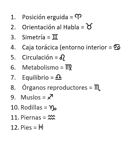 Sólo para aclarar la asociación de los doce sectores de la curva solar prenatal con las regiones de nuestra organización física, damos las siguientes correlaciones, siguiendo las indicaciones de El hombre a la luz del ocultismo, la teosofía y la filosofía de Rudolf Steiner, principalmente en las conferencias V y VI: