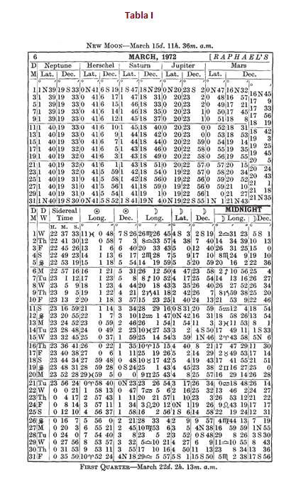 El tiempo sideral tiene un fundamento diferente. El cero del día sideral es el momento en que el punto de cruce entre la eclíptica -la trayectoria del Sol durante el año vista desde la Tierra- y el ecuador de la Tierra, proyectado en el cielo, se desplaza por el meridiano de cualquier localidad geográfica del planeta. El Sol parece estar en este punto de cruce en el momento del equinoccio de primavera, en el hemisferio norte. En ese día del año, la hora sideral coincide con la hora local. Esto se indica en las efemérides astronómicas disponibles (mostradas en la Tabla I). Por ejemplo, las Efemérides Astronómicas de Raphael para 1972 dan la Hora Sidérea para el 22 de marzo como 0h 0m 21s para el mediodía de cualquier Hora Local. Después de eso, la Hora Sidérea avanza cada día unos 4 minutos de la hora, porque el Sol se mueve aparentemente, podemos decir, hacia adelante en la eclíptica, lo que hace que el punto de cruce de la eclíptica y el ecuador celeste se mueva sobre el meridiano de cualquier localidad dada, 4 minutos antes. Por lo tanto, la hora sideral del 23 de marzo = 0h 4m 17s, la del 24 = 0h 8m 14s, lo que significa que el Cero (o el adelantamiento del punto de cruce de la eclíptica) fue esa cantidad de tiempo antes del mediodía de la hora local. Cuatro minutos x 360 días (o aproximadamente un año) es igual a 1440 minutos, o 24 horas, lo que significa que hemos regresado, después de un año, al momento en que el mediodía sideral volverá a coincidir con el mediodía local.