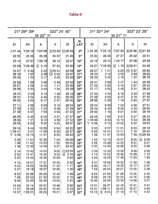 A continuación, tenemos que emplear una Tabla de Casas para la latitud del lugar de nacimiento de Kepler. Weil- der-Stadt está a 45° 46′ de latitud norte. La tabla correspondiente figura en la obra Häeusertabellen del Dr. W. A. Koch, p. 165 (véase la tabla II). Tomamos la hora sideral 21h 29m 39s. La pequeña diferencia de unos 2 minutos no altera la imagen de forma muy incisiva. En el medio, entre las columnas de la derecha y de la izquierda, encontramos los grados de latitud, por ejemplo, para 49° Norte. La columna «A» proporciona el punto ascendente o naciente para ese momento como 22 40, según los signos eclípticos. Encima de toda esta columna se da la cifra global «M» 20. Este era el punto culminante (meridiano) de la eclíptica, válido para todas las localizaciones a lo largo del mismo meridiano. El resto de la información contenida en estas Tablas podemos, por el momento, obviarlo. Dibujamos una tabla para esta situación:
